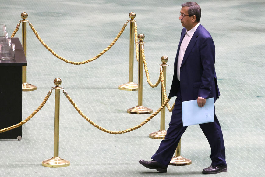 عبدالناصر همتی، وزیر دارایی ایران، در 2 مارس 2025 در جریان جلسه استیضاح خود در تهران، به سمت جایگاه سخنرانی می‌رود تا برای نمایندگان مجلس سخنرانی کند.